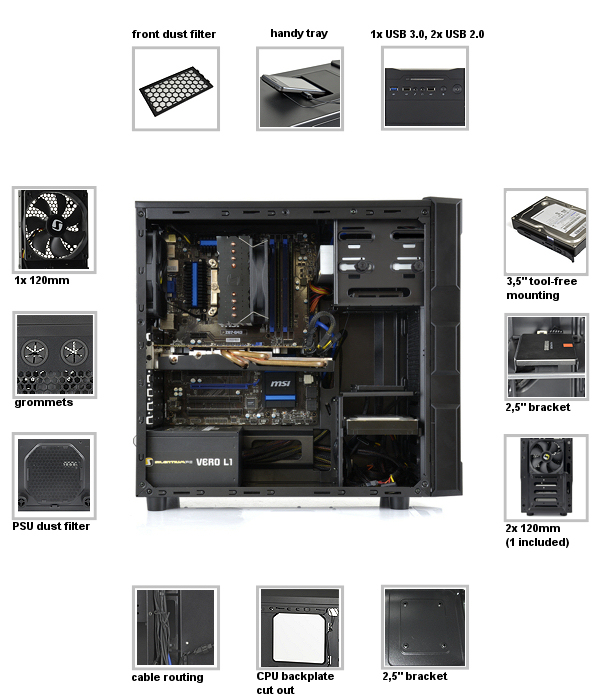 フロントI/OはUSB3.0×1、USB2.0×2、オーディオ入出力×2で、フロント/電源ユニット部ダストフィルタ、ケーブルマネジメント機構、水冷ホース用ホール、小物収納トレイ(トップ)などのギミックを備える。