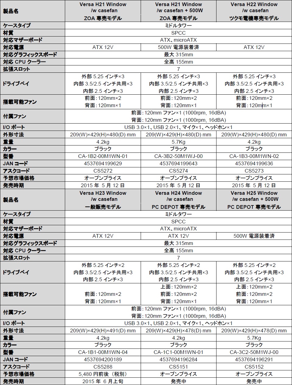 一般販売向けの標準モデル「Versa H23 Window /w casefan」の他、フロントフェイス違いのバリエーションモデルとして、ZOA専売モデル「Versa H21 Window /w casefan」「Versa H21 Window /w casefan + 500W」、ツクモ専売モデル「Versa H22 Window /w casefan」、PC DEPOT専売モデル「Versa H24 Window /w casefan」「Versa H25 Window /w casefan + 500W」の計6種がラインナップ。なお「+500W」モデルには、定格出力400W(最大出力500W)のATX電源ユニットがマウントされる。