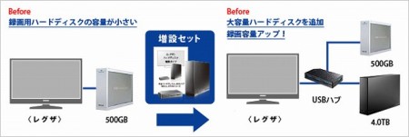 新しい外付けHDD「HDCL-UTC」シリーズとUSB3.0対応のUSBハブ「US3-HB4AC」のセットで構成され、既存の外付けHDDと同時に使用できるのが特長。「レグザ」はUSBハブ使用による複数台のHDD利用に対応しており、これまで録画した番組をそのままに、4TBの大容量を追加することができる。