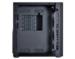 マザーボードトレイを挟んで、向かって右側に電源ユニットとストレージ、左側にマザーボードとグラフィックスカードを配置することで、熱源を分離し効率的な冷却が可能。さらにグラフィックスカード搭載部の障害物を排除でき、全長370mmまで対応する高い拡張性を実現した。