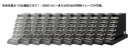 2.5/3.5インチのSATAドライブを6台まで接続でき、1:5コピーや6台同時イレースが可能。さらに本体背面に用意された連結コネクタを使えば10台までのデイジーチェーンに対応、最大60台までの同時処理をサポートする。