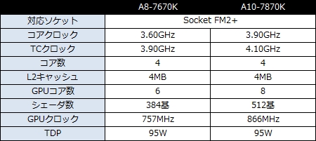 Computeコアの構成はCPUコア4基、GPUコア6基で、今年5月に発売されたA10-7870Kに比べると、GPUコアが2基削減。また動作クロックもCPUが定格3.60GHz(TC時3.90GHz)、GPUが757MHzへと抑えられている。