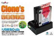 3台のHDDを同時に認識できるHDDスタンドの新製品。外部インターフェイスはUSB3.0で、PCレスでHDDをまるごとコピーできる「クローン機能」を備える。