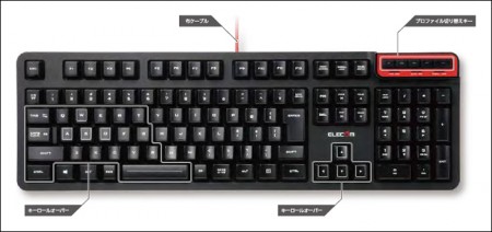 キースイッチはメンブレン方式、キー配列は日本語108キーで、主要24キーはキーロールオーバーに対応(同時押しは最大12キーまで)。キーピッチは19mm、キーストロークは4.0mmとされる。