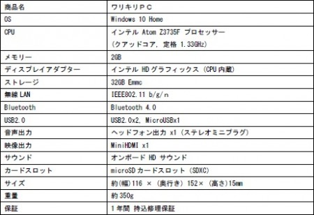 外形寸法は、W116×D152×H15mm、重量約350g。OSはWindows 10 Homeがプリインストール。製品保証は1年間で、ドン・キホーテグループのオリジナル電子マネー「majica」会員は2年間に延長される。