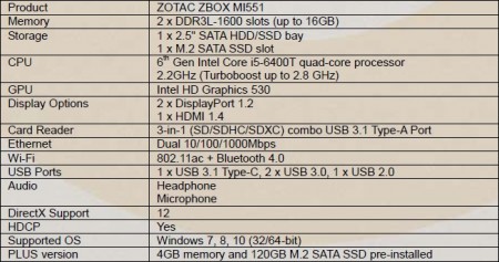 188mm角筐体を採用する「ZBOX M」シリーズに属するモデルで、チップセットはIntel 100シリーズ、メモリスロットはDDR3L×2(最大16GB)を備え、ストレージは2.5インチSATA×1、M.2×1に対応。グラフィックスチップはCPU内蔵のIntel HD Graphics 530が採用される。