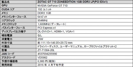 TDP25Wの省電力GPU GeForce GT 710を採用するグラフィックスカードの新製品。冷却システムはパッシブヒートシンクで、補助電源コネクタは非搭載となる。
