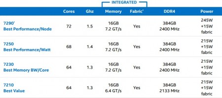 現在明らかにされている製品ラインナップは、72コア / 1.5GHzの「Xeon Phi 7290」を筆頭に計4モデル。外部メモリはDDR4 2400 / 2133MHz、最大容量は384GBで、消費電力は215W+15W(Fabric)もしくは245W+15W(同)とされる。