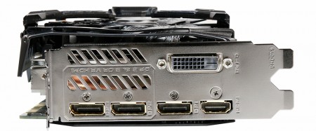 バスインターフェイスはPCI-Express3.0(x16)、出力インターフェイスはリア部にDVI-D×1、DisplayPort1.4×3、HDMI2.0×1を備え、内部にはVR出力用のHDMI×2を搭載する。補助電源コネクタは8+6pin。