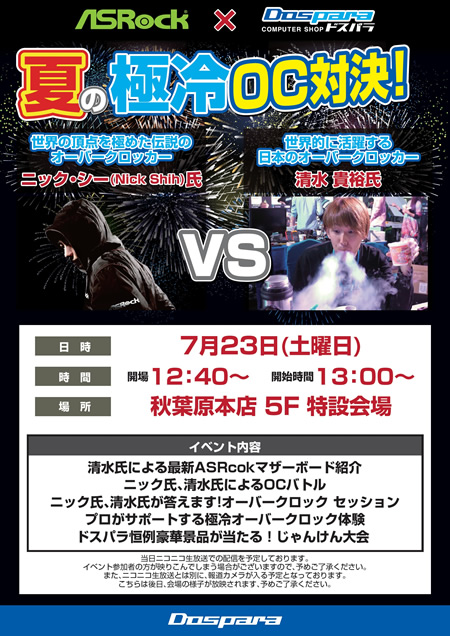 伝説のオーバークロッカー・Nick Shih氏と、清水 貴裕氏によるオーバークロック対決が、ドスパラ秋葉原本店5階で開催される。日時は今週末23日(土)。