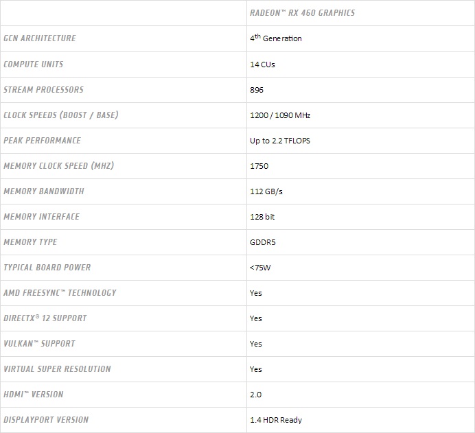 カジュアルゲーマー向けの下位モデル「Radeon RX 460」は、ストリームプロセッサ数は896基、コアベースクロックは1,090MHz、ブーストクロックは1,200MHz、メモリクロックは7,000MHz(1,750MHz×4)。メモリバス幅は128bit、ビデオメモリはGDDR5で、ピーク性能は2.2TFLOPSとされる。