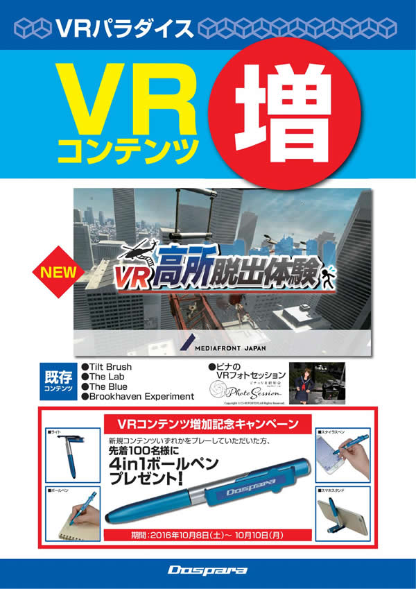 ドスパラVRパラダイスでは、VRコンテンツ追加記念キャンペーンとして、体験者先着100名にドスパラオリジナル超便利な4in1ボールペンを進呈。参加費用は無料で、先着順に体感できる。なお既存コンテンツも予約ブースにて楽しむ事ができる。