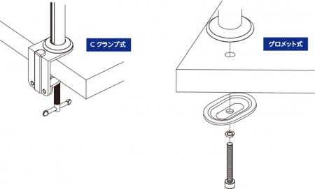 取り付け可能天板はクランプ時が厚さ10~45mm、奥行90mm以上、幅100mm以上、グロメット時が厚さ10~50mm、奥行90mm以上、幅100mm以上、固定穴は10~15mm。VESA規格は100 / 75mm、耐荷重は6.0kg、対応サイズは23.6インチサイズまで。