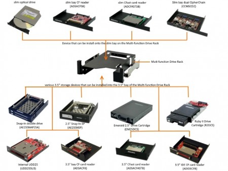 一般的な3.5インチドライブとスリム光学ドライブに加え、同社が販売中の各種オプションアダプタに対応。余りがちな5.25インチオープンベイを多機能ベイに変えることができる。
