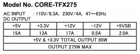 「CORE-TFX275」は、スリムPCで採用されるTFX規格に対応する電源ユニット。対応規格はTFX12Vで、容量は275W。