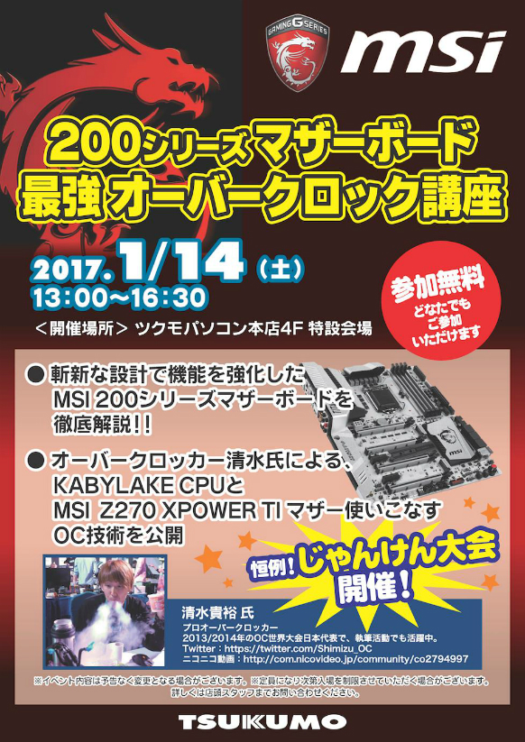 MSIは来る1月14日(土)、ツクモパソコン本店4階特設会場で、新製品解説・オーバークロックイベント「MSI 200シリーズマザーボード最強オーバークロック講座」を開催する。