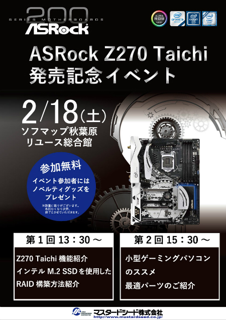 マスタードシード株式会社は来る2月18日(土)、ソフマップ リユース総合館1Fにて、Kaby Lake向け新マザーボード「Z270 Taichi」の発売記念イベント「ASRock Z270 Taichi発売記念イベント」を開催する。