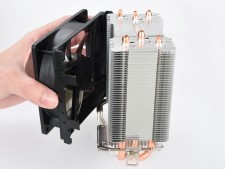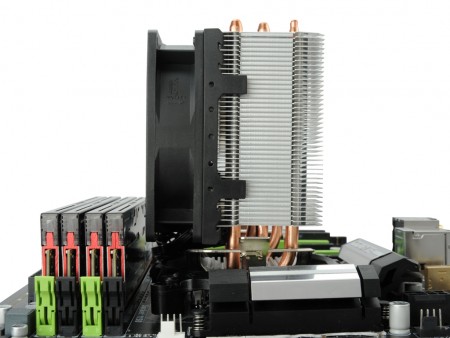 92mm口径ファンを採用するコンパクトモデルで、φ6mm×3本のヒートパイプはダイレクトタッチ方式で搭載。またメモリスロットとの干渉を抑えるため、ヒートパイプを非対称に搭載する「アシンメトリーヒートパイプデザイン」や、ヒートパイプ周辺のエアフローを改善する「Vortex Generatior Flow」(VGF)、ヒートシンクの空気滞留を抑える「Vacuum Effect」(VEF)などの独自技術を採用する。