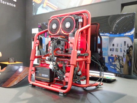| 2016年の「COMPUTEX」に登場した、ユニークなオープンフレームケースがようやくの正式発表。液晶をマウント可能なほか、フレームに冷却水を循環させる機能を備えていた |
